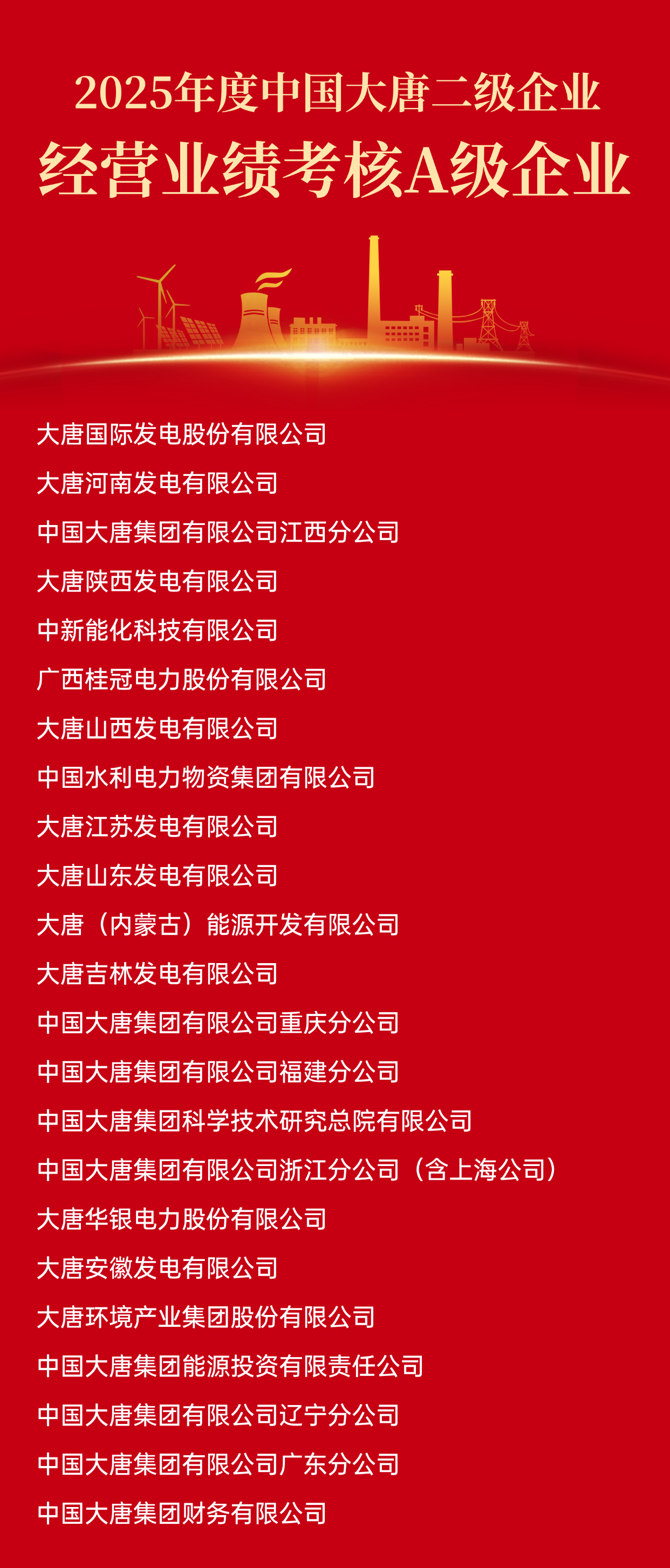 根據(jù)《中國大唐集團(tuán)二級企業(yè)及負(fù)責(zé)人經(jīng)營業(yè)績考核辦法》及有關(guān)規(guī)定,2025年度二級企業(yè)經(jīng)營業(yè)績考核結(jié)果已經(jīng)中國大唐2026年第1次董事長專題會審議通過。A級企業(yè)名單如下: